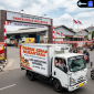 Truk putih yang menjadi fokus utama bukan truk biasa. Spanduk di boksnya dengan tegas menuliskan “PENINGIN TERUJI -18°C”. Spesifikasi ini sangat krusial. Suhu minus 18 derajat Celsius adalah standar internasional untuk menjaga keamanan pangan beku (frozen food), mencegah pertumbuhan bakteri, dan mengunci nutrisi serta rasa produk seperti kebab. Tulisan “MODERN, AMAN, TERPERCAYA” bukan sekadar slogan, melainkan standar operasi wajib bagi logistik pangan modern.